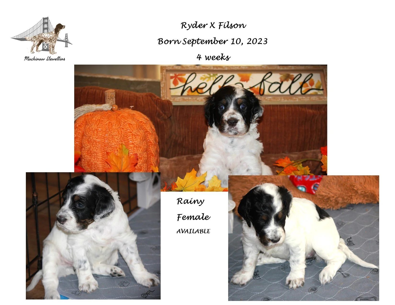 And then there was one… we have one remaining female puppy available from our Ryder X Filson litter. Rainy is a beautiful black, white and tan ticked tricolor - her coloring is already coming in and is looking to be gorgeous! If you are interested in adding this beautiful, sweet bird dog to your family, please send an email inquiry and/or download a puppy application below, submit via email to us and we will respond with pricing and reservation information.